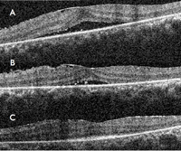 Figura 47. OCT de ojo izquierdo del paciente de la Figura 46. A) Fluido subretiniano subfoveal al diagnóstico. B) A los 3 meses, disminución del fluido. C) A los 6 meses, resolución total del fluido.