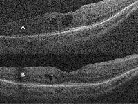 Figura 48. Retinosis pigmentaria ligada al X. Edema macular cistoideo en ojo derecho. A) Espacios quísticos intraretinianos. B) Mejora anatómica del edema tras 1 mes de tratamiento con acetazolamida por vía oral.