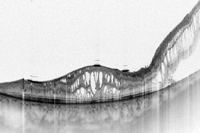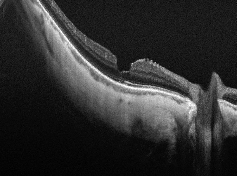 Figura 1. Desprendimiento de retina crónico. Se observan separaciones en las capas intraretinianas (Topcon SS-OCT DR-1).