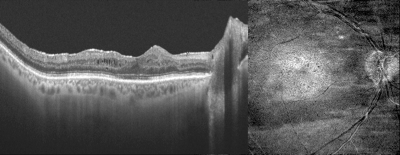 Figura 10. Quistes en la retina interna. Plano horizontal y coronal (en face) (Topcon SS-OCT DR-1).