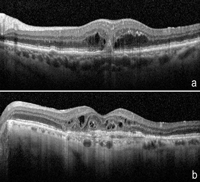 Figura 3. Edema de la RNS y NVC. Complejos neovasculares incipientes con aumento homogéneo de la reflectividad (a), o edema intraretiniano de las capas externas de la RNS (a), pueden observarse en los casos de proliferación angiomatosa retiniana (RAP). Quistes intraretinianos de acúmulo de fluido (b), así como tubulaciones de la retina externa (ORT) (b), pueden representar aspectos crónicos de la enfermedad. El componente cicatricial con fibrosis lesional puede verse como un aumento de la reflectividad y del grosor en el complejo EPR-Br-cc en al área subfoveal (b).