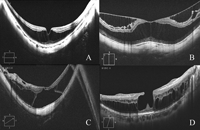 Figura 2. Diferentes aspectos tomográficos en pacientes con retinosquisis miópica. A) Foveosquisis externa sin signos de tracción vitreomacular visibles. B) Foveosquisis interna y externa. C) Foveosquisis con desprendimiento foveal y agujero lamelar externo. D) Foveosquisis externa con agujero lamelar interno y restos del córtex vítreo adheridos a la superficie interna de la retina.