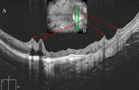 Figura 3. A) Perfil tomográfico de un corte vertical cercano a la papila donde se aprecia la tracción centrípeta ocasionada por la rigidez de los vasos retinianos. B) Imagen de fondo de ojo en la que se visualiza la zona de corte del scan B sobre la retina.