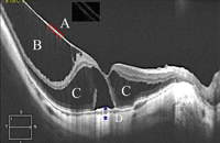 Figura 4. Aspecto tomográfico de una típica retinosquisis miópica, en el que se observa cómo la estructura traccional está compuesta por dos capas, probablemente la hialoides posterior aplicada junto con la membrana limitante interna. En el recuadro, aplicando filtros se distinguen ambas estructuras. B) Retinosquisis interna en la que se observan los axones proximales de las células junto al estiramiento de las células de Müller. C) Porción externa de la retinosquisis, en la que se aprecia el estiramiento de las asas de Henle. D) Aspecto típico de la coroides en la región del estafiloma, que se encuentra claramente reducida en grosor en comparación con los ojos emétropes.