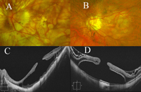 Figura 6. Utilidad de la OCT en el diagnóstico diferencial entre dos imágenes funduscópicas de levantamiento macular en con alta miopía (A y B). C) Foveosquisis de larga evolución, con formación de un agujero macular interno y desaparición de las estructuras columnares intraretinianas que conectan la retina interna con la externa. D) Desprendimiento foveal con agujero macular de espesor completo. La capa de fotorreceptores aparece como una línea hiperreflectiva separada del epitelio pigmentario de la retina.