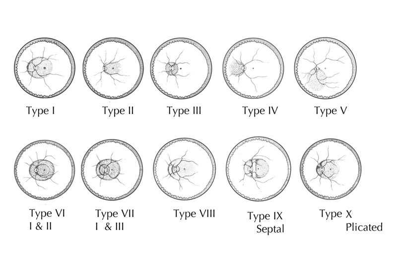 3 realizó una clasificación de los tipos de estafiloma posterior basada en la localización de la ectasia estudiada mediante oftalmoscopia indirecta. Describió diez tipos de estafilomas posteriores: cinco simples y cinco compuestos (