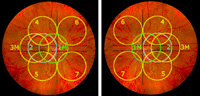 Figura 1. Ubicaciones de los siete campos estándar del ETDRS en los ojos derecho e izquierdo utilizando una cámara convencional.