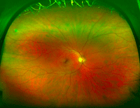 Figura 11. Retinografía con Optomap del mismo paciente con enfermedad de Coats después del tratamiento. (Cortesía del Prof. P.E. Stanga, Manchester Royal Eye Hospital, Manchester Vision Regeneration (MVR) Lab at NIHR/Wellcome Trust Manchester CRF).