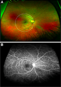 Figura 8. A) Imagen en color de campo amplio. B) Angiografía fluoresceína de un niño de 14 años de edad con uveítis intermedia y vasculitis retiniana. El círculo blanco simula el área cubierta por una imagen convencional de 60°12.