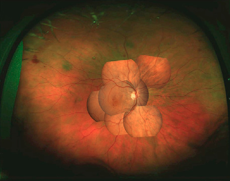Figura 9. Montaje de retinografías con RetCam de un niño con enfermedad de Coats después del tratamiento con drenaje e inyección intravítrea de Avastin. (Cortesía del Prof. P.E. Stanga, Manchester Royal Eye Hospital, Manchester Vision Regeneration (MVR) Lab at NIHR/Wellcome Trust Manchester CRF).