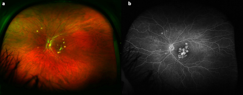 Figura 9. Coroiditis punteada interna (a). La angiografía muestra lesiones cicatriciales con hiperfluorescencia en anillo en la zona macular, con fibrosis central correspondiente a una membrana neovascular antigua. En el sector nasal se observan lesiones activas, con hiperfluorescencia central y fuga en las fases tardías (b).