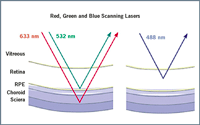 El láser rojo (633 nm) realiza el barrido desde el epitelio pigmentario hasta la coroides (Figura 1).