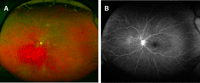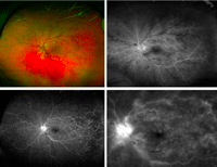 Figura 4. Retinografía de campo amplio de oclusión venosa central aguda y angiofluoresceingrafía.