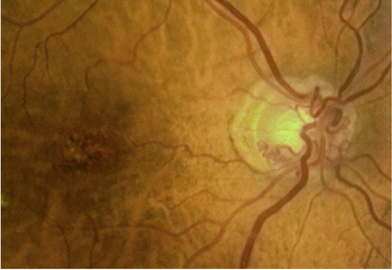Figura 7. Oclusión de la vena central crónica. Se aprecian shunts optociliares en la papila y alteración del epitelio pigmentario macular.