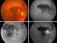 Figura 4. DMAE con membrana neovascular subretiniana activa y hemorragia secundaria. En la imagen de autofluorescencia (arriba a la derecha) se observa una hipoautofluorescencia bien delimitada correspondiente a la hemorragia subretiniana, por bloqueo de la autofluorescencia de base del EPR subyacente. En esta misma imagen, a nivel de la membrana neovascular se observa una isoautofluorescencia, probablemente relacionada con el inicio reciente de la lesión. Las imágenes inferiores muestran el comportamiento angiográfico de dicha neovascularización coroidea.