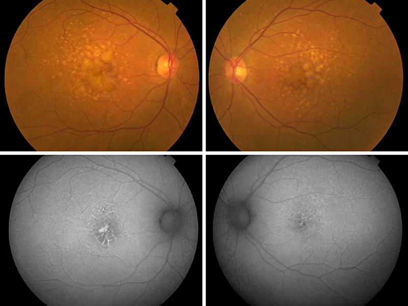 Figura 1. Drusas blandas confluentes en el polo posterior que se traducen en una hipoautofluorescencia central rodeada de un anillo hiperautofluorescente.