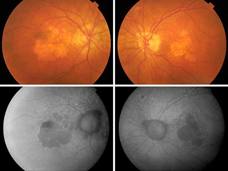 Figura 3. DMAE de tipo atrófico. Las áreas de atrofia geográfica se muestran como zonas bien delimitadas de hipoautofluorescencia, rodeadas por diferentes patrones de autofluorescencia anormal, predominantemente con un moteado hiperautofluorescente.