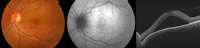 Figura 1. Corioretinopatía serosa central aguda de 3 semanas de evolución. La retinografía mediante filtro de autofluorescencia (imagen del centro) todavía no muestra prácticamente alteraciones. Además, la señal de autofluorescencia se ve afectada por la presencia del desprendimiento neurosensorial.