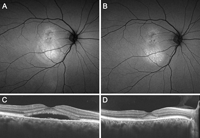Figura 2. Caso de corioretinopatía serosa central (CSC) crónica con varias recidivas. Se aprecian en ambas imágenes de autofluorescencia (A y B) alteraciones granulares hiperautofluorescentes, típicas de los casos de CSC de evolución cronificada. En la imagen A (se corresponde a la tomografía de coherencia óptica C) se observa presencia activa de fluido, que en la autofluorescencia se ve como una zona de depósito gravitacional hiperautofluorescente inferior. En la imagen B (se corresponde con la tomografía D), el fluido está en fase de reabsorción y ya no se observa el mismo patrón gravitacional, aunque persisten las alteraciones hiperautofluorescentes (que no desaparecerán hasta pasadas varias semanas de la resolución del desprendimiento).