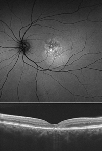 La hiperautofluorescencia que se observa en las fases más agudas de la CSC tiende a desaparecer progresivamente en cuanto se reabsorbe el fluido subretiniano. Como se verá más adelante, cuando la enfermedad no se resuelve, o cuando recidiva de forma repetida, empiezan a aparecer cambios de naturaleza irreversible en la autofluorescencia.
