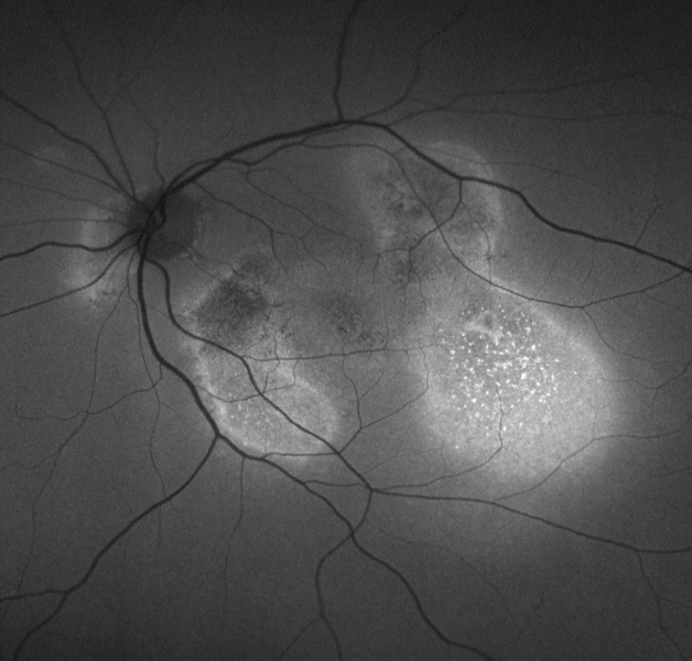 16 se encontró que pequeñas lesiones compatibles con acúmulos de células del EPR producían hiperautofluorescencia, tanto con autofluorescencia de onda corta como con autofluorescencia infrarroja. En cambio, algunas lesiones puntiformes hiperautofluorescentes con autofluorescencia de onda corta no lo eran con autofluorescencia infrarroja, lo cual podría deberse a una lesión más directa del fotorreceptor (que no contiene melanina, pero sí lipofuscina).