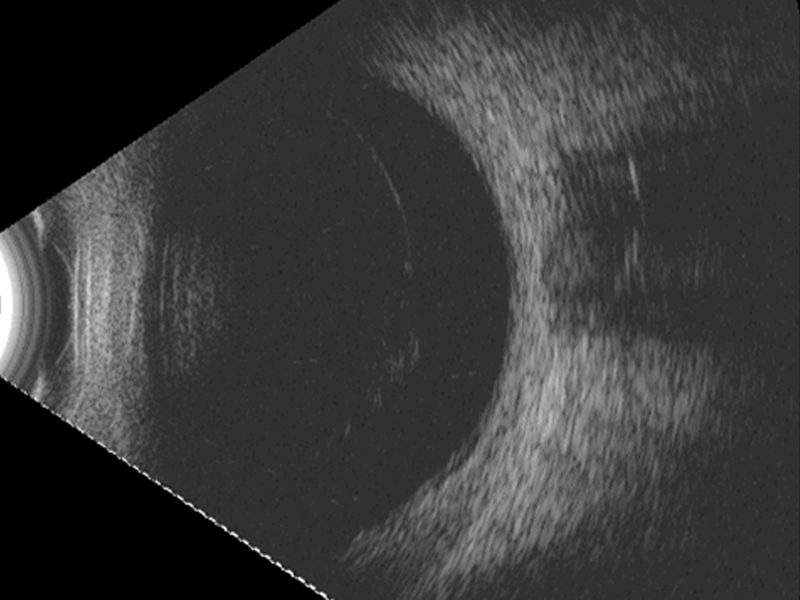 Figura 8. Cristalino en el polo posterior. Cara anterior lisa y de alta reflectancia, con importante sombra acústica por su alta densidad.