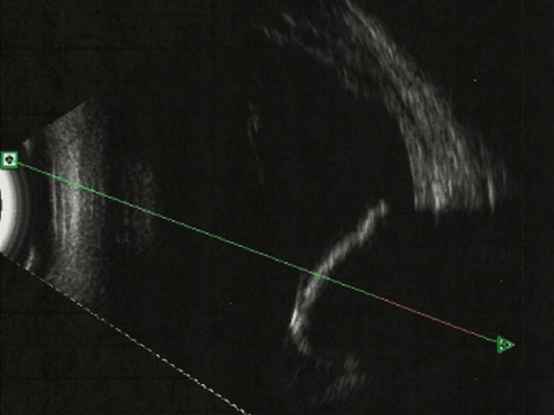 Figura 7. Cuerpo extraño en el polo posterior con alta reflectancia que proyecta una sombra acústica marcada.