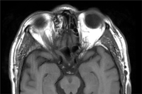 Figura 3b. RM T1 axial con contraste. La musculatura extrínseca ocular de la región (oblicuo superior) queda incluida en las alteraciones óseas lo que condiciona una restricción del la polea y el cuadro de síndrome de Brown adquirido.