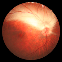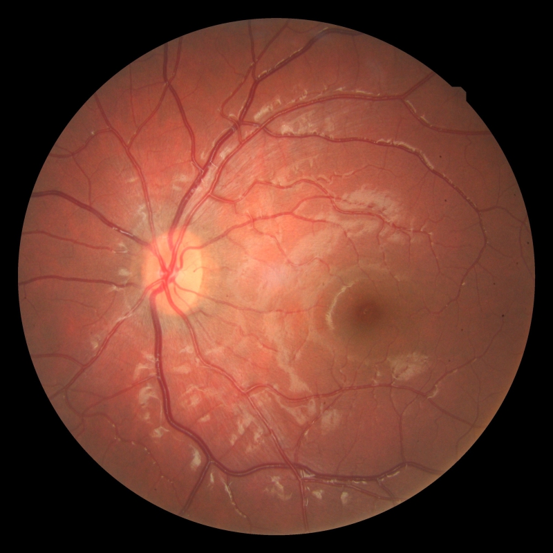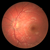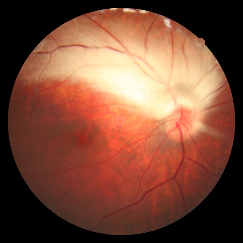 Figura 1a. Retinografía de un paciente con ambliopía secundaria a presencia de fibras de mielina que provoca deprivación y anisometropía.