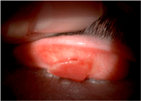 Figura 1. Ojo derecho: membranas protuberantes a partir de conjuntiva tarsal superior.