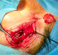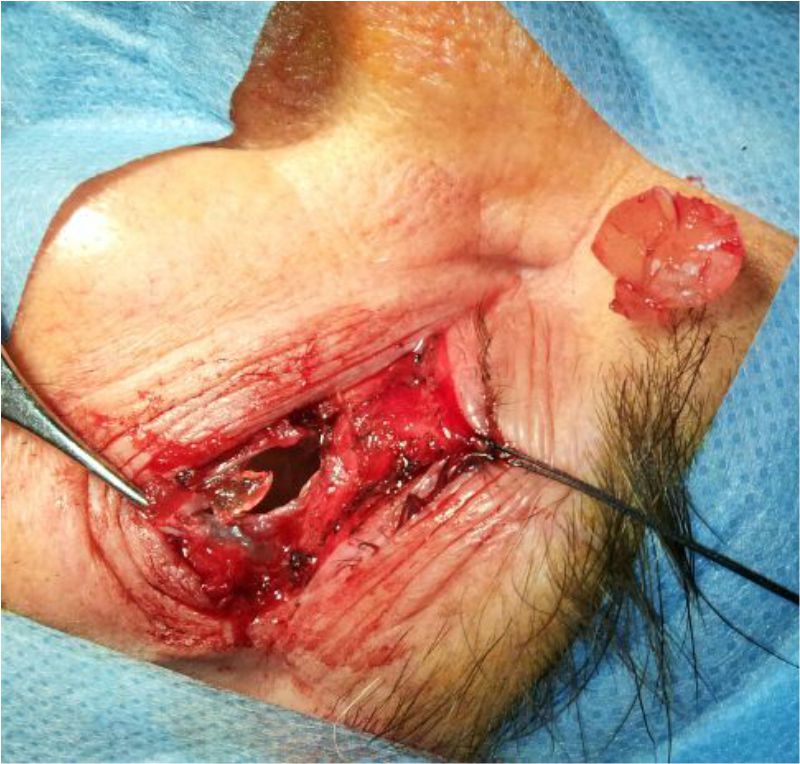 Figura 3. Imagen del abordaje quirúrgico en que se muestra la cápsula fibrosa abierta con restos de material obtenido de aspecto translúcido.