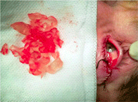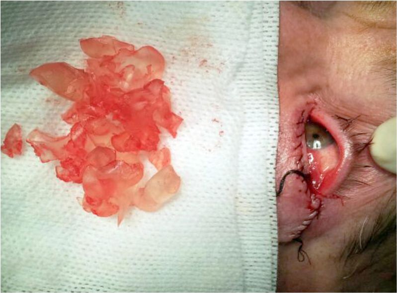En los casos presentados, ambos pacientes fueron intervenidos mediante una única incisión por vía transpalpebral (sobre párpado inferior en el primera caso y superior en el segundo). La extracción del hidrogel se realizó mediante una cucharilla de evisceración como instrumento principal para minimizar la fragmentación y a su vez proteger la esclera. Se obtuvo un material inorgánico, translúcido, extremadamente friable envuelto por una fina cápsula fibrosa (