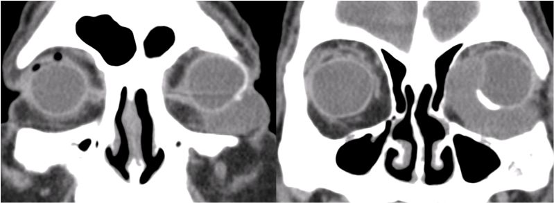 Figura 1. TC orbitario (cortes coronales). Se aprecia una masa isodensa, homogénea, bien delimitada que rodea el globo ocular izquierdo desde su porción anterior, temporal e inferior hacia región medial más posterior.