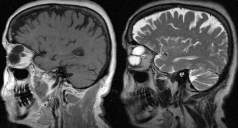 Figura 2. RMN (cortes sagitales). Izquierda: imagen de T1 que muestra una lesión de márgenes delimitados, homogénea e hipointensa que comprime el globo ocular desde su región superior. Derecha: imagen en T2 con la misma masa hiperintensa.