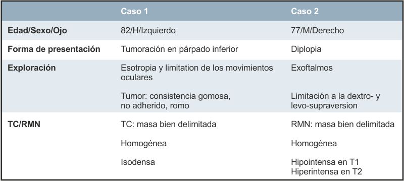 Varón de 82 años, miope con antecedente de desprendimiento de retina en el ojo izquierdo (OI) y cirugía de cataratas en ambos ojos, 33 y 26 años antes, respectivamente. Refería esotropia del OI y la presencia de una tumoración de 20 años de evolución en el tercio externo del párpado inferior del mismo. La exploración mostraba una tumoración subcutánea de superficie roma, consistencia gomosa, no adherida a planos profundos, con extensión a región intraorbitaria; y limitación de los movimientos oculares en todas direcciones sin diplopia asociada por baja visión.