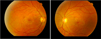Figura 1. Retinografías. Fondo de ojo con coloración de “bronce golpeado” y presencia de flecks perifoveales.