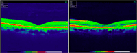 Figura 2. Tomografía de coherencia óptica. Atrofia foveal bilateral más pronunciada en el ojo derecho (imagen de la izquierda).