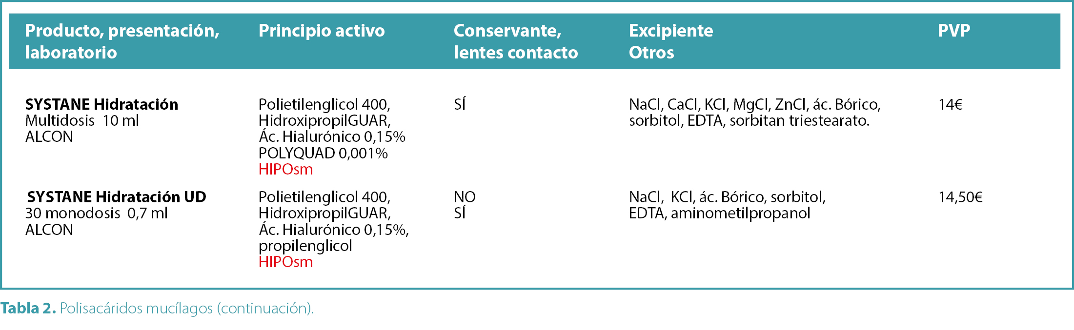Actualización en lágrimas artificiales" aparecieron de forma errónea los datos referentes a ácido hialurónico de la Tabla 2. En lugar de 0,1% el dato correcto es 0,15% en ambos casos.