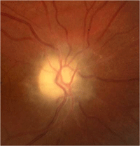 Figura 4. Atrofia óptica post papiledema. La retinografía revela palidez papilar con márgenes del disco poco definidos, así como hialinización de los vasos que emergen de disco.