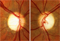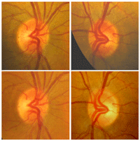 Figura 7. Neuropatía óptica tóxico nutricional. En la fase inicial el disco óptico aparece normal o existe una discreta hiperemia (arriba) En fase evolucionada, desaparecen estos fenómenos y se observa cierta palidez del cuadrante temporal en grado variable (abajo).
