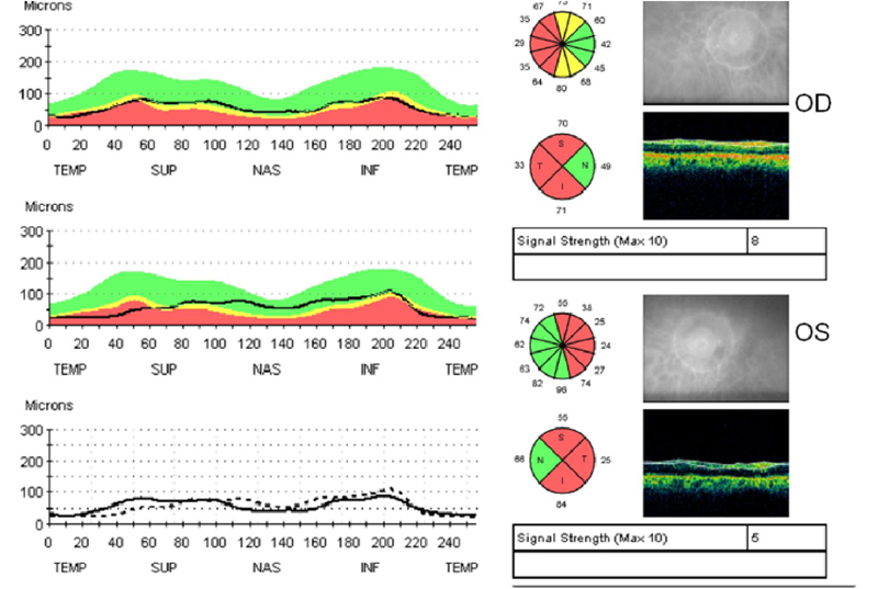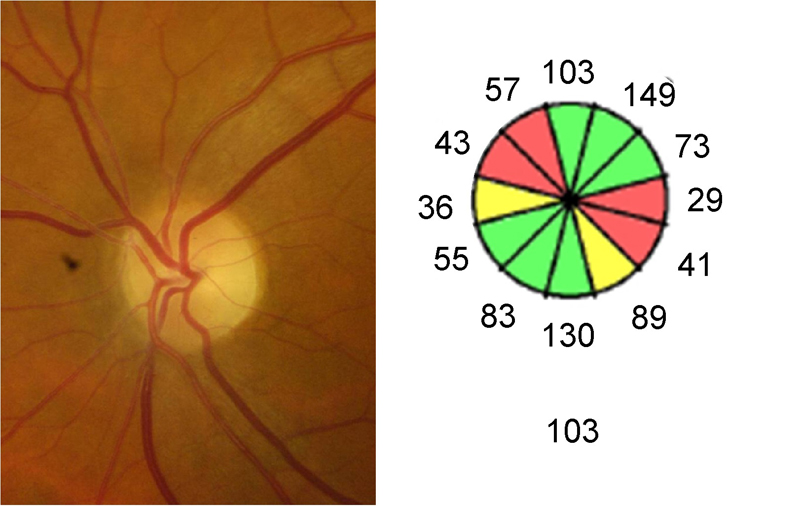 Figura 1. Palidez papilar en banda (atrofia óptica en pajarita). En la retinografía se aprecia mayor palidez en los sectores nasal y temporal del disco, mientras el cuadrante superior e inferior presenta una coloración normal del anillo neuro-retiniano. La OCT reproduce este patrón de pérdida de fibras en el la distribución por sectores horarios.