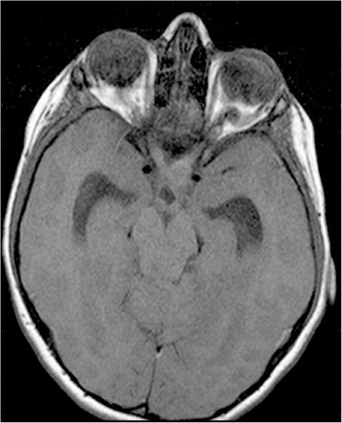Figura 3. Glioma nervio óptico que invade quiasma RMN T1.