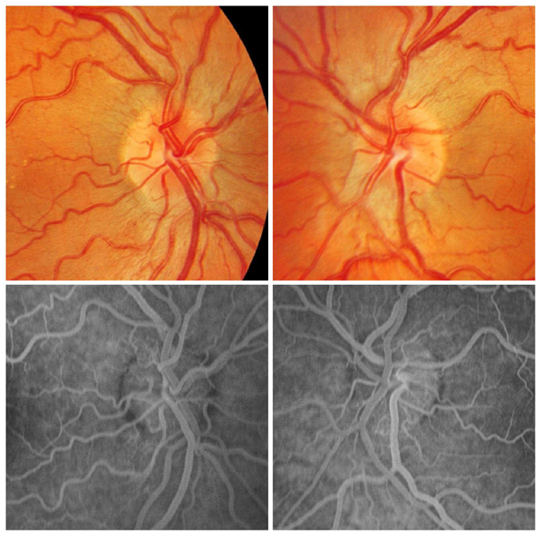 Figura 6. Neuropatía óptica hereditaria de Leber. En fase aguda aparecen telangiectasias peripapilares y tumefacción del disco óptico secundario por el aumento de tamaño de los axones de las células ganglionares de la retina Como no hay fuga de contraste en la angiografía fluoresceínica, este fenómeno se conoce como pseudoedema y se atribuye a la microangiopatía de la retina.