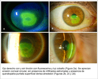 Figura 2. Fotografía lámpara de hendidura con y sin fluoresceína. Erosión corneal.