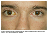 El paciente duerme siempre boca abajo y del lado derecho, apoyando la hemicara derecha sobre la almohada. Presenta una asimetría facial orbitaria desde siempre con engrosamiento palpebral del mismo lado derecho. Como antes hemos mencionado, tiene tortícolis desde pequeño por una lesión nerviosa cervical tras una distocia de nalgas (Figura 3 y Figura 4).
