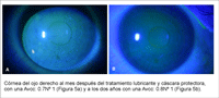 Con el tratamiento lubricante y la cáscara nocturna en el ojo derecho no presenta hiperemia, la cornea está brillante y transparente, y la tinción con fluoresceína es negativa. Mejora notablemente su agudeza visual, a los tres meses en ojo derecho es de 0,75 y en izquierdo de 0,90. Al año de tratamiento llega al 0,85 de visión en ambos. En la actualidad, mantiene una buena agudeza visual y presenta una mínima queratopatía puntata superficial fina a nivel del limbo inferior en ojo derecho (Figura 5).