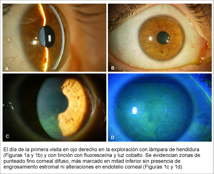 - Biomicroscopía (segmento anterior) de ojo derecho: córnea brillante y transparente con fino punteado difuso algo más marcado en la zona media paracentral inferior. Aspecto de limbo normal. La tinción con Rosa de Bengala: ojo derecho existe cierta tinción de limbo inferior tanto corneal como en conjuntiva. Ojo izquierdo tinción negativa y biomicroscopía normal (Figura 1).