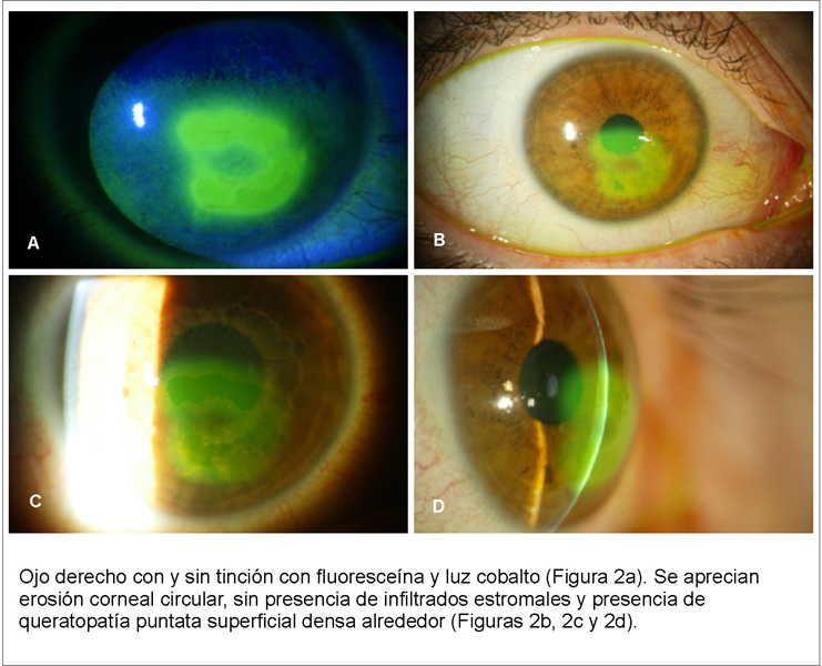 Ante el cuadro clínico se descartó una conjuntivitis folicular por Clamidia con queratopatía puntata superficial del ojo derecho con cultivos negativos, una secundaria a un germen atípico y una queratoconjuntivitis alérgica. También se descartó una posible ambliopía de ojo derecho, se realizaron biometrías (normales. OD: 23,46 OI: 23,27). Siguió distintos tratamientos antimicrobianos tópicos y orales con una leve mejoría de la agudeza visual con corrección (ojo derecho de 0,5 y ojo izquierdo de 0,85) y sin desaparición completa del punteado corneal. En el curso evolutivo de nuestro paciente sufrió de forma súbita y al levantarse de la cama una erosión corneal en ojo derecho que remitimos tras tratamiento con pomada antibiótica y vendaje compresivo (Figura 2).