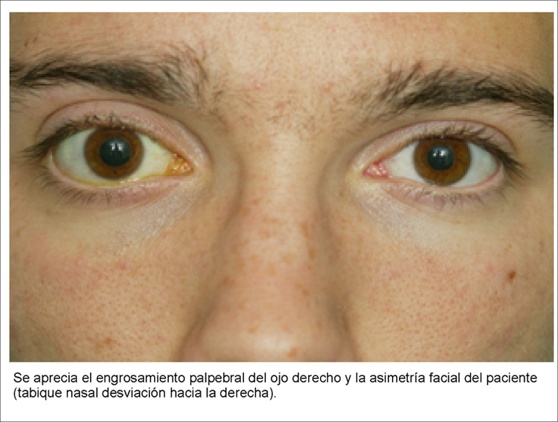 Paciente varón de 17 años de edad que acude a nuestro centro con “conjuntivitis” recidivantes en ojo derecho desde hace dos años, sin ritmo estacional y nunca afectación del ojo izquierdo. Durante estos dos años, fue tratado con varios tipos de lágrimas artificiales, oclusión con vendaje y suero autólogo sin mejoría. Refiere pérdida de visión progresiva desde entonces. El último oftalmólogo que le visitó, le mandó un TAC orbitario con resultado normal y le propuso realizar cirugía de descompresión orbitaria del ojo derecho. El paciente acude para valorar segunda opinión.Antecedentes personales sistémicos
