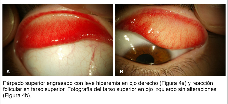 - Anejos de ojo derecho: párpado superior engrosado, de aspecto más prominente que ojo izquierdo. No hiperlaxitud palpebral. Sin lagoftalmía y con fenómeno de Bell +++. Leve hiperemia margen palpebral superior sin blefaritis. No hiperemia conjuntival bulbar. Reacción folicular en tarso superior. El ojo izquierdo: de aspecto normal. En ambos ojos no se palpan induraciones.